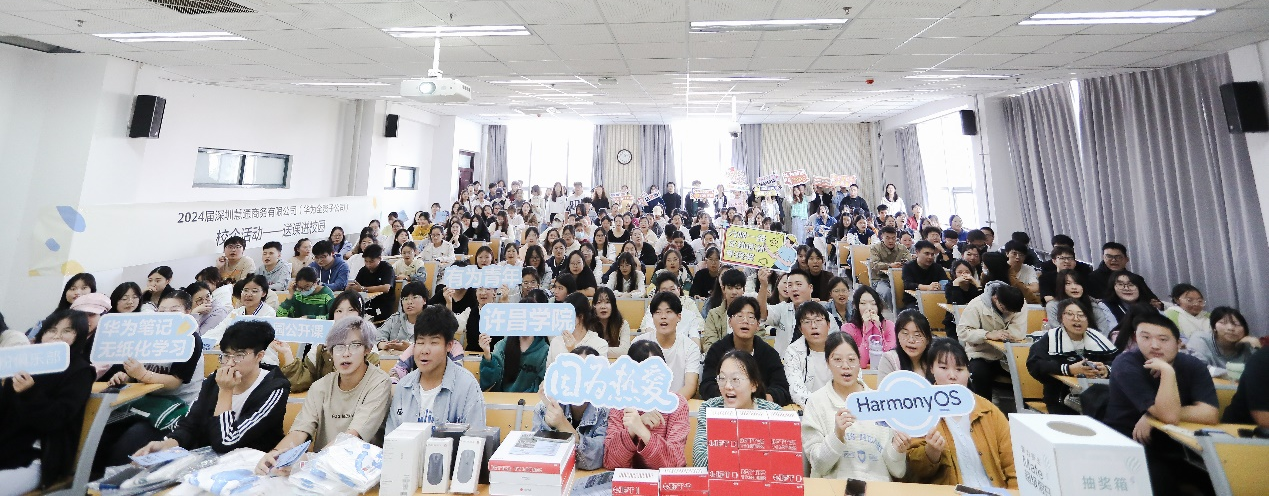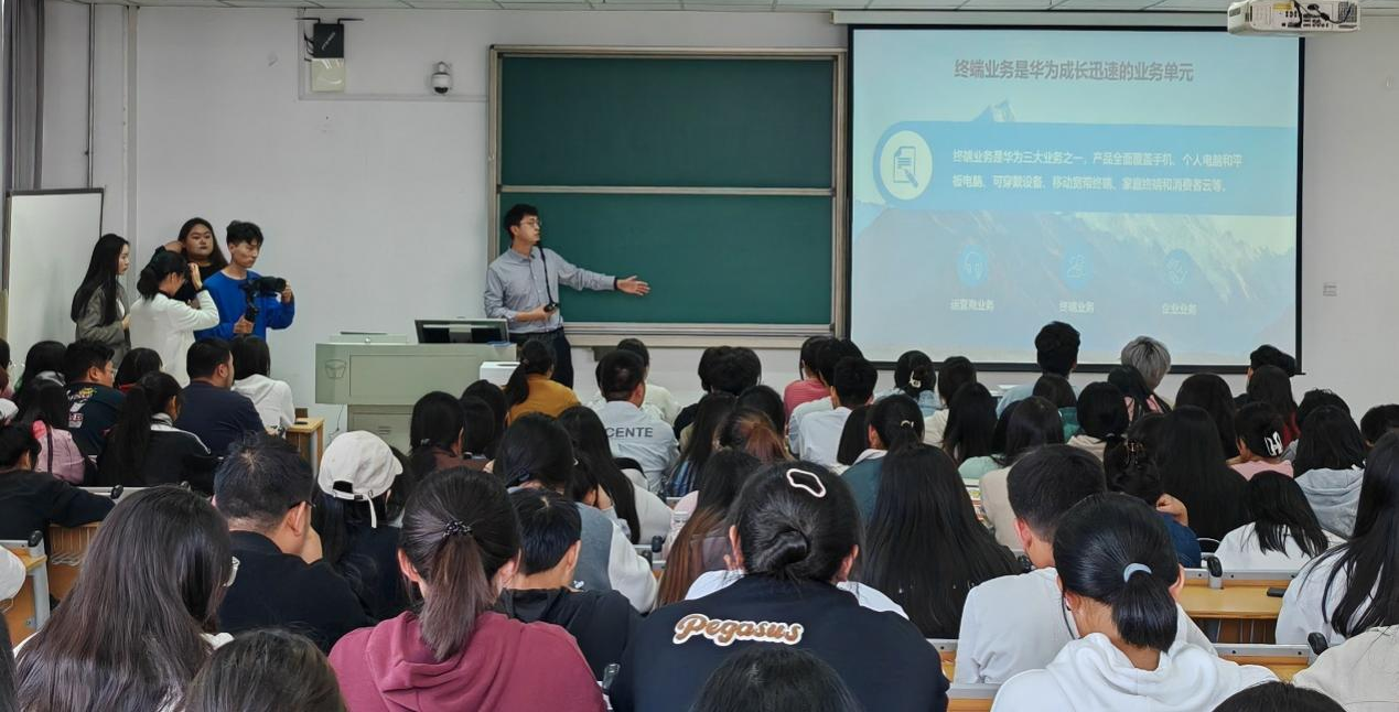 企业宣讲环节由深圳慧通商务有限公司张喜洋主持,华为终端许昌市地市主管邓允锲就公司背景、招聘岗位、激励机制、赋能成长、工作地点、应聘流程几个板块开展详细介绍,让同学们对公司的工作环境、薪资待遇、培养机制有了更深层次的了解。