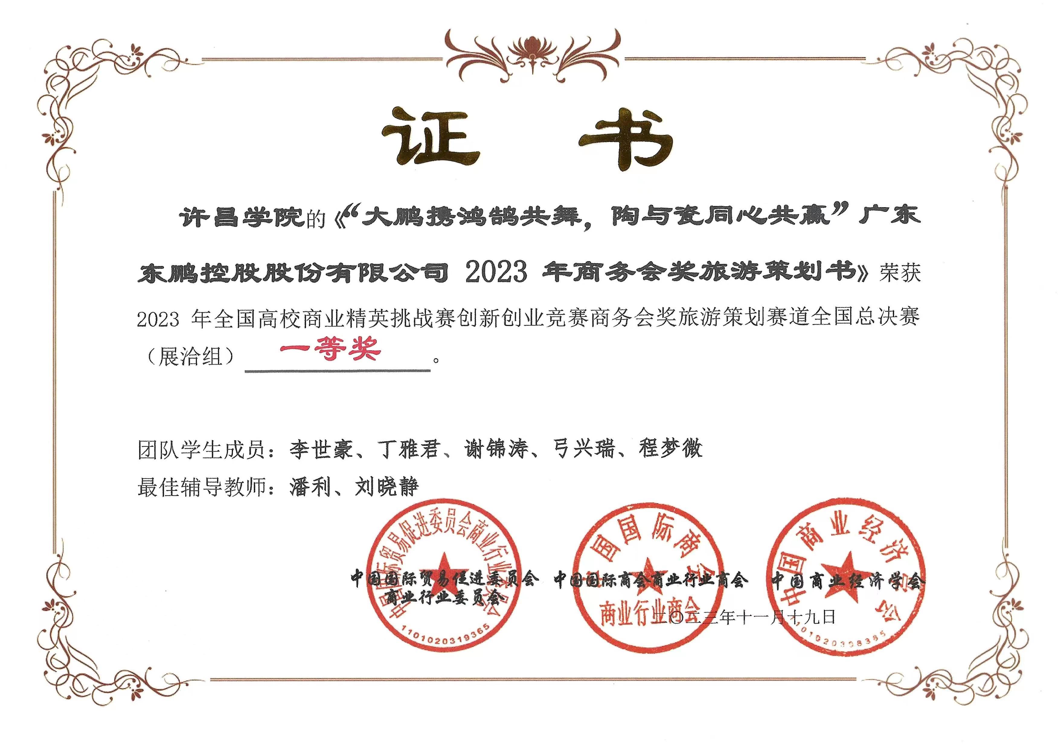 11月17日至19日,2023年全国高校商业精英挑战赛创新创业竞赛商务会奖旅游策划赛道全国总决赛在河南省三门峡举行。由德赢官网教师潘利、刘晓静指导,2022级旅游管理专业李世豪、丁雅君、弓兴瑞、程梦微、谢锦涛等5名学生组成的参赛队,凭借精心的策划与沉稳的现场发挥,最终荣获总决赛一等奖和展洽赛道一等奖,并进入全国十强,获得赴新加坡商务活动策划大赛入围资格。