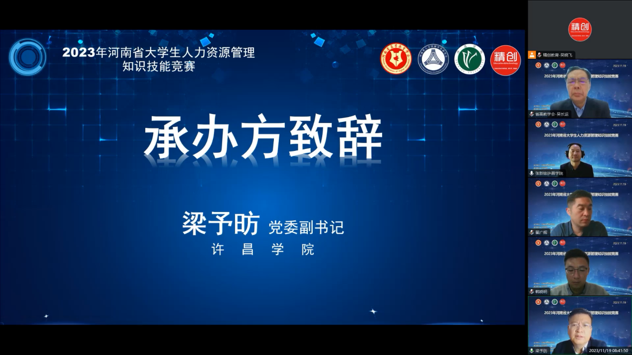 11月19日,2023年河南省人力资源管理知识技能竞赛线上开幕。河南省高等教育学会秘书长吴长运、河南省高等教育学会办公室主任杨颖超、河南省人力资源开发研究副会长韩晓明、许昌学院党委副书记梁予昉、德赢Vwin官方区域合作伙伴党委书记翟广辉、浙江精创教育科技有限公司副总经理金斌等领导和嘉宾出席开幕式。开幕式由德赢Vwin官方区域合作伙伴院长张新铭主持。