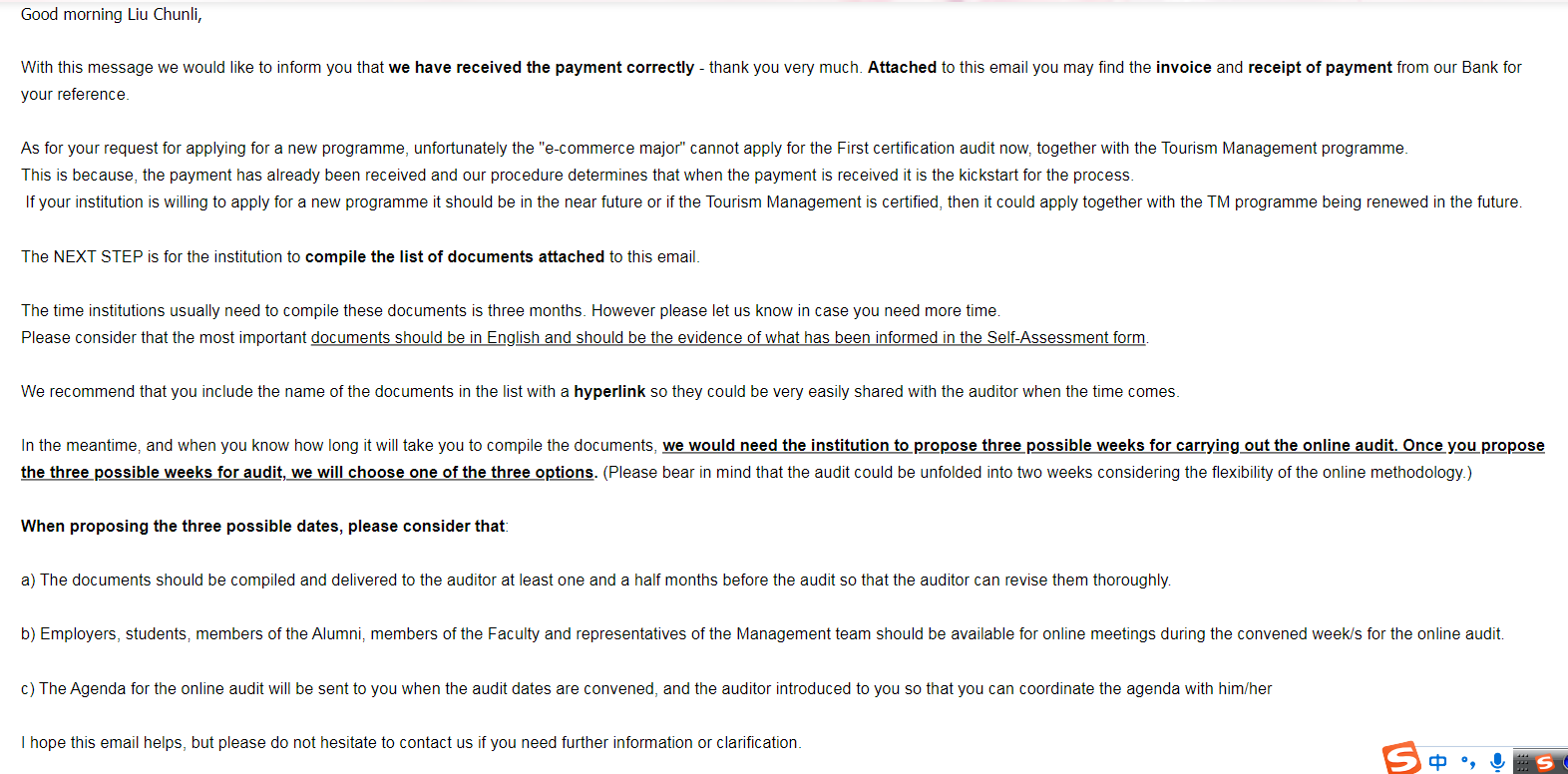 2023年11月13号,德赢官网旅游管理专业收到联合国世界旅游组织教育质量认证组织的邮件,经过专家全面评估后,审评通过旅游管理专业的自评报告,允许进入下一阶段的认证评审。