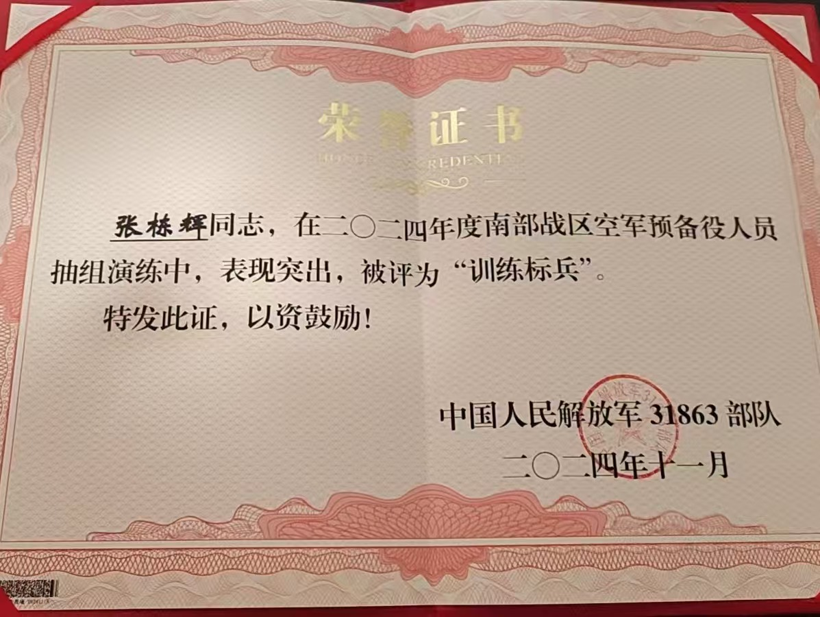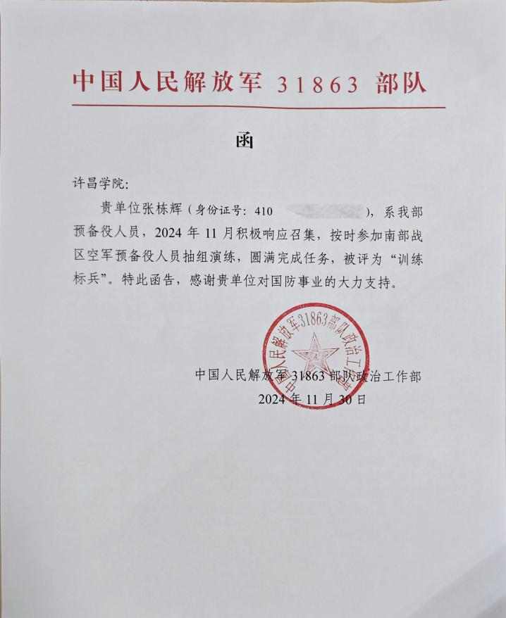 近日,中国人民解放军31863部队致函德赢官网,积极肯定了德赢Vwin官方区域合作伙伴张栋辉同学响应召集、于11月圆满完成南部战区空军预备役人员抽组演练任务,获评“训练标兵”,并对学校大力支持国防事业表示感谢。