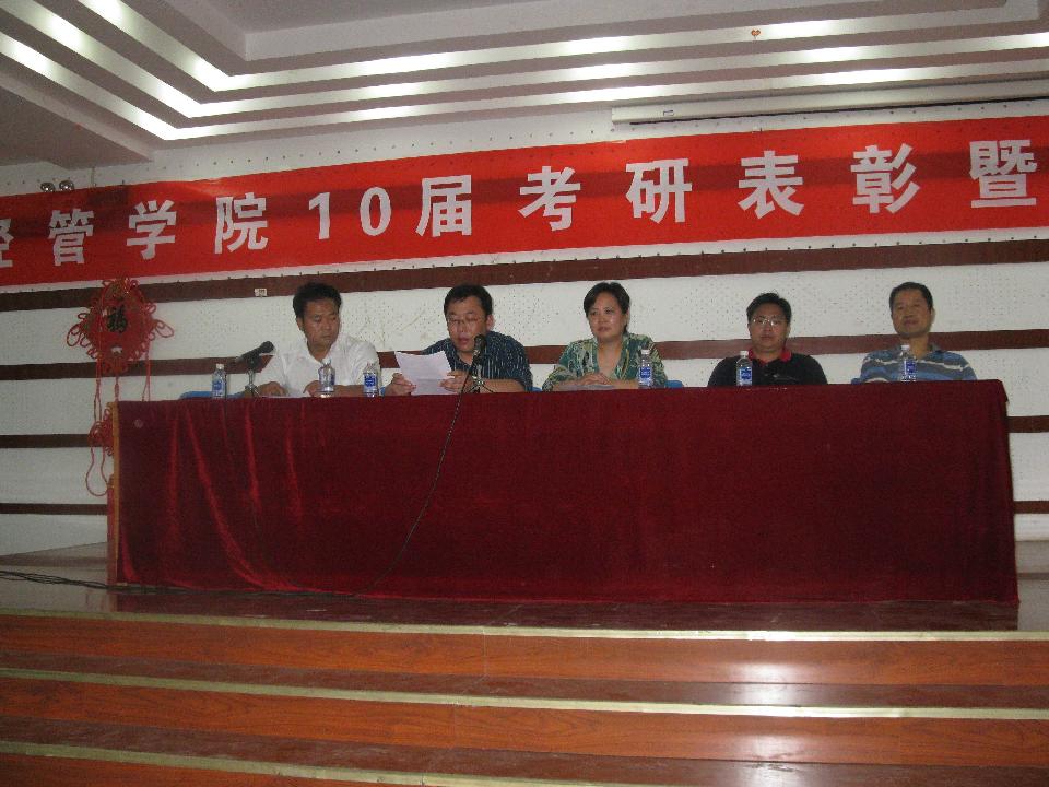 5月28日,经济与管理学院在东区新餐厅四楼演播厅举行10届考研暨经验交流会,党总支书记郭海清、党总支副书记王宏伟、院长助理张新铭、刘其涛及06级考研同学参加了此次会议,会议由团总支副书记王旭光主持。