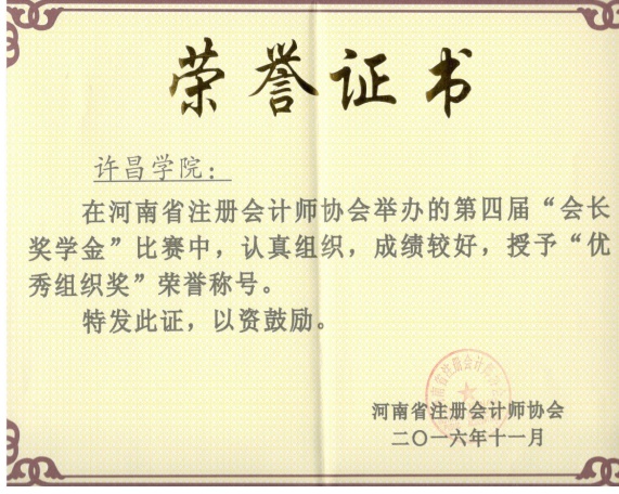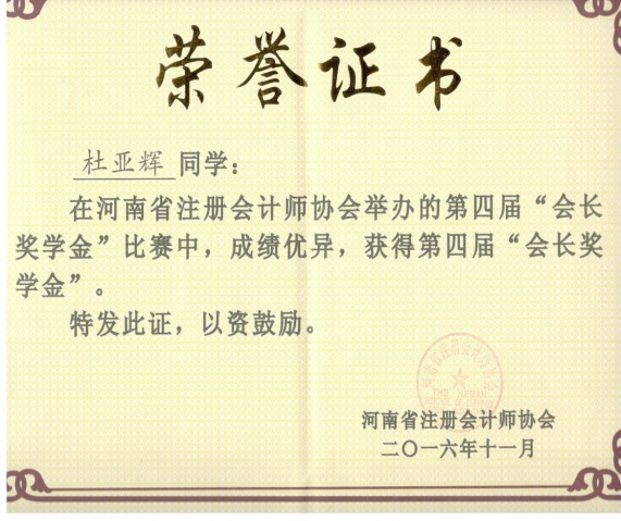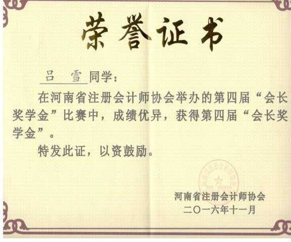 经过河南省注册会计师协会委托没有学生参赛的高校专家对试卷评阅,本届“会长奖学金”共有来自26所高校的200余名同学获奖。德赢官网13级工商管理专业(会计方向)同学吕雪和13级财务管理专业同学杜亚辉分别获奖。
