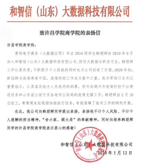 5月19日德赢官网收到一封来自“和智信(山东)大数据科技有限公司”的感谢信,信中表扬了德赢官网2016级电子商务(大数据应用)专业韩鹏辉同学的优秀实习事迹表现。