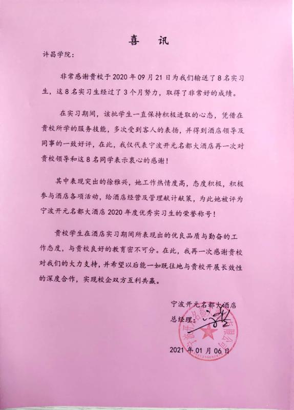 喜讯:德赢官网学生徐雅兴被宁波开元名都大酒店评为“2020年度优秀实习生”