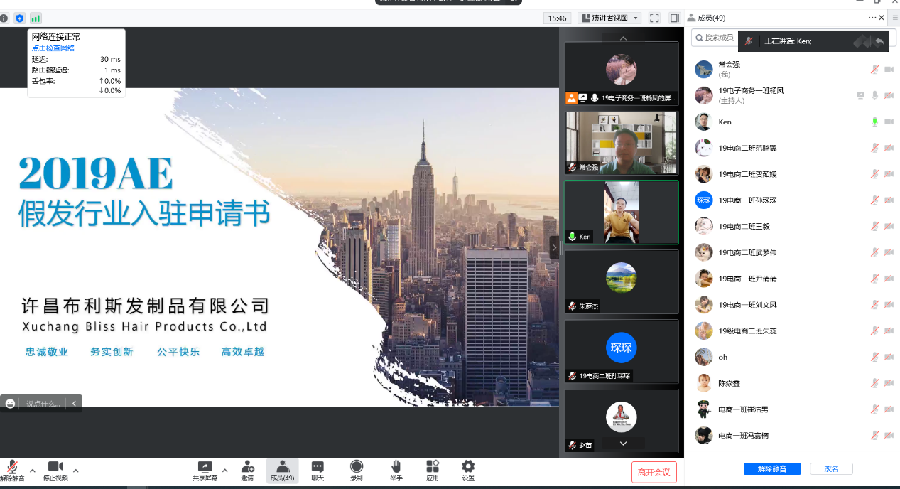 为了更好地推动德赢官网2019级电子商务专业毕业实习及就业工作,8月17日由德赢官网电子商务教研室联系许昌当地优秀电商企业(摩登秀发制品有限公司、龙生源商贸有限公司、布利斯发制品有限公司、瑞宇商贸有限公司、玖豪盈商贸有限公司、华彩商贸有限公司、希文发制品有限公司、河南舫源教育科技集团有限公司)与学生开展了线上双选会。德赢Vwin官方区域合作伙伴副院长朱彦杰就毕业实习的任务、注意事项、安全工作做了明确要求,电子商务专业负责常会强对此次双选会的受邀企业做了简单介绍,2019级电子商务专业的全体学生参加了此次双选会。