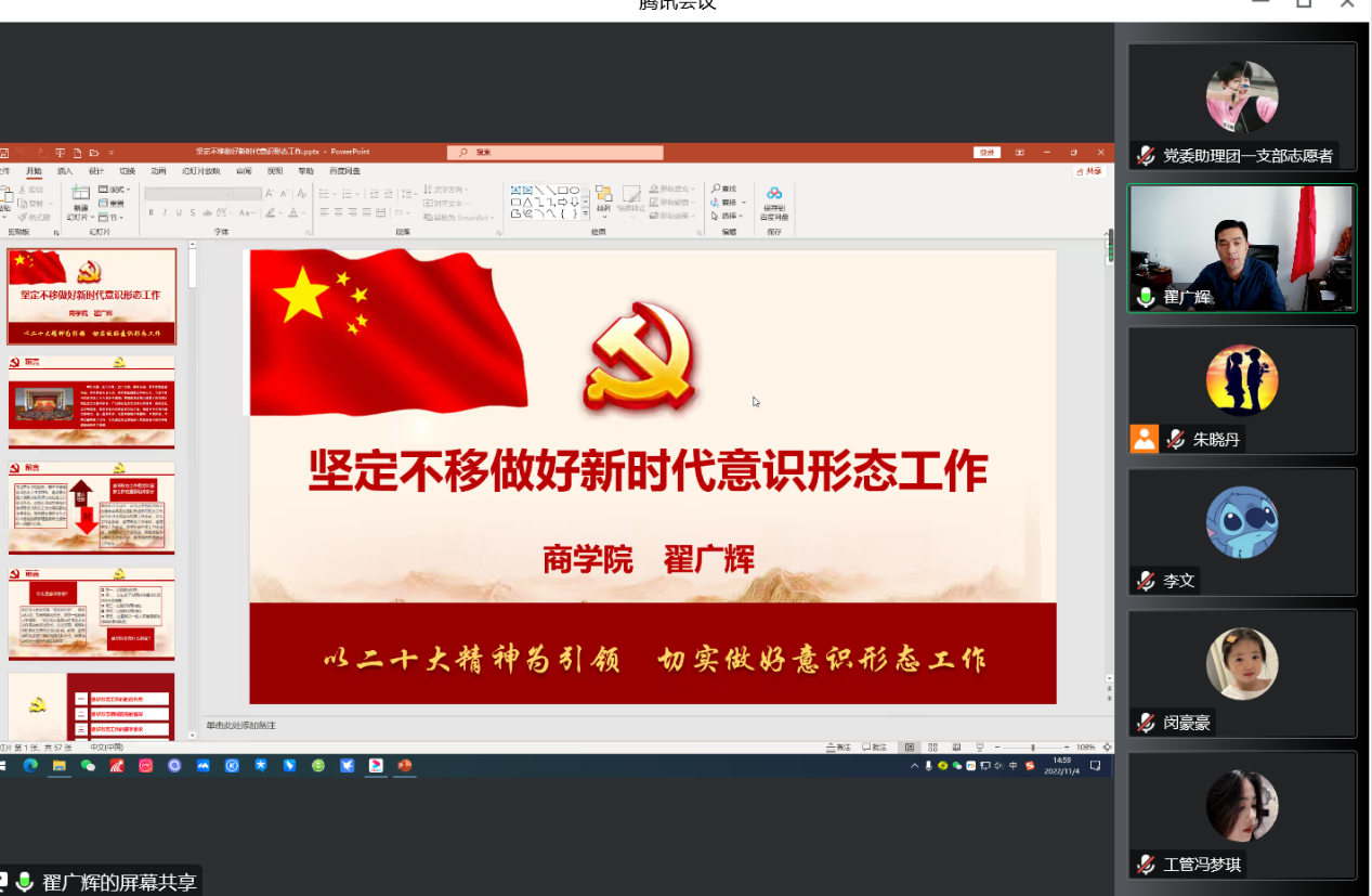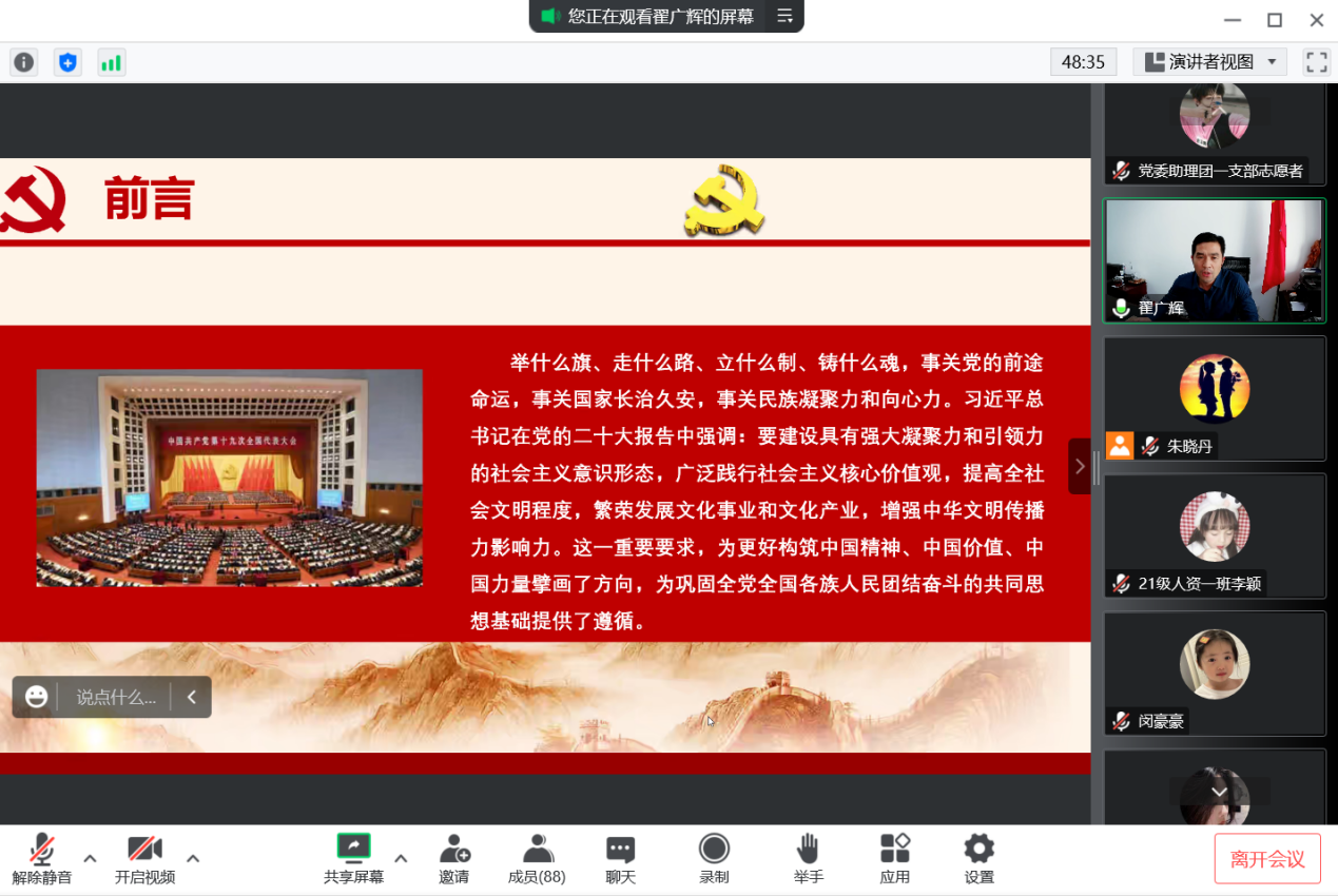 习近平总书记在党的二十大报告中强调:要建设具有强大凝聚力和引领力的社会主义意识形态,广泛践行社会主义核心价值观,提高全社会文明程度,繁荣发展文化事业和文化产业,增强中华文明传播力影响力。翟广辉书记用真实鲜活的案例,语重心长的语言从意识形态工作的地位作用、意识形态领域面临的情况、意识形态工作的基本要求、以党的二十大精神为引领做好意识形态工作四个方面讲述了做好意识形态工作的必要性、重要性,同时他希望入党积极分子们充分认识到意识形态工作的极端重要性,深入学习意识形态工作的相关知识,弘扬正能量,在学习、生活上起到模范带头作用。
