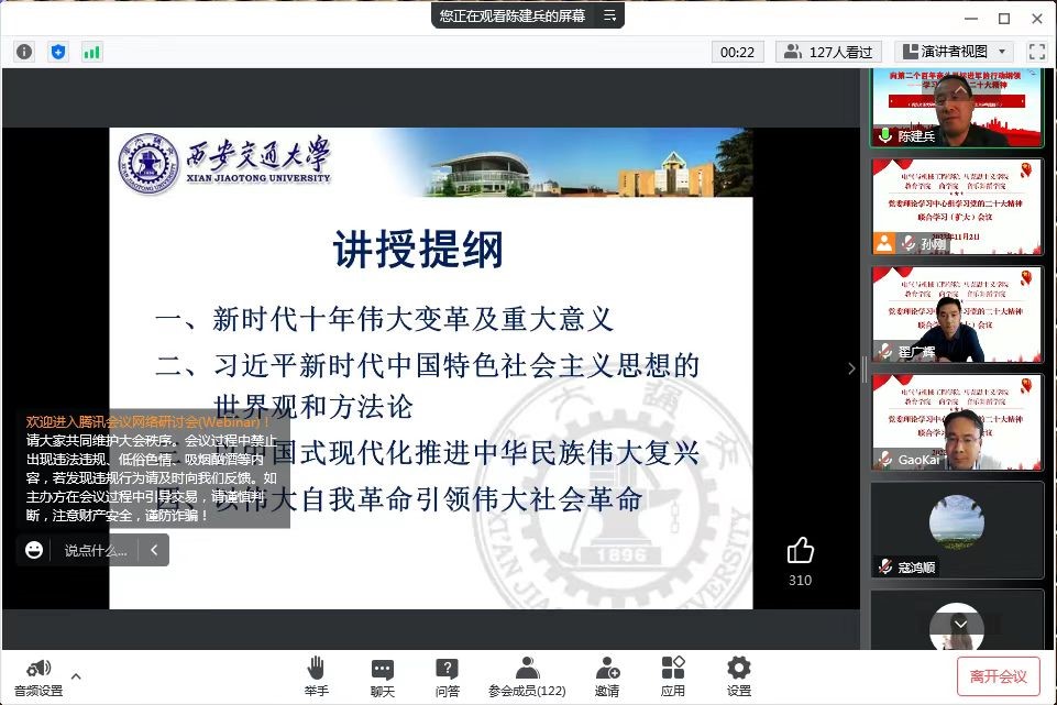电气与机械工程学院党委特邀西安交通大学马克思主义学院副院长、博士生导师陈建兵教授作了题为《向第二个百年奋斗目标进军的行动纲领——学习领会党的二十大精神》的专题报告。报告中,陈建兵教授梳理了新时代十年伟大变革的重大意义,阐释了习近平新时代中国特色社会主义思想的世界观方法论,分析了中国式现代化的内涵要求和实现路径,总结了党的自我革命的基本要点,报告内涵丰富、条理清晰、分析深刻,对深化党的二十大精神的学习具有非常强的指导意义。