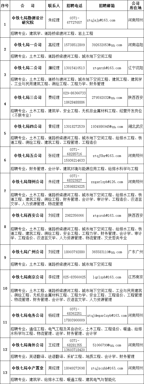 因企业发展需要,中铁七局所属各单位现招聘优秀高校毕业生,欢迎加盟中铁七局,招聘单位及专业如下: